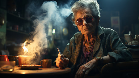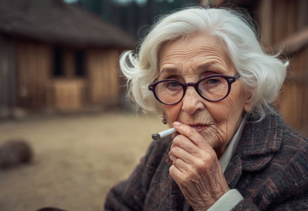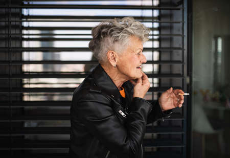 Portrait of a mature blonde retired woman smoking a cigarette