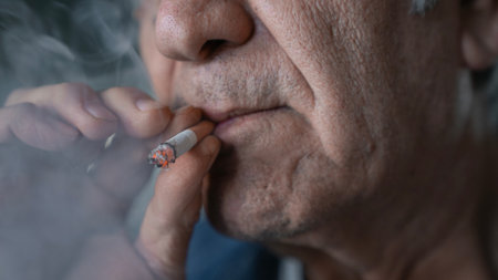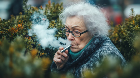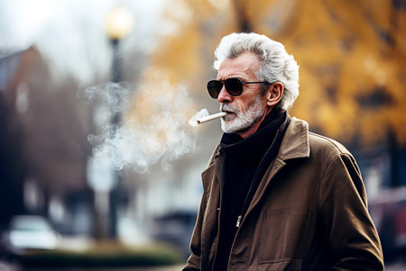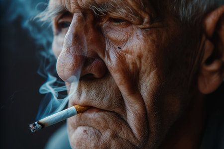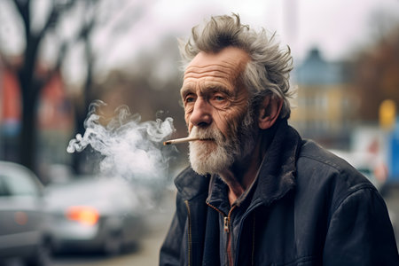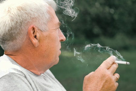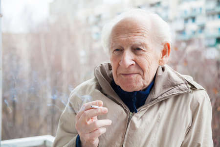 An old senior man smoking cigarette outside, smoke addiction, bad habbit.