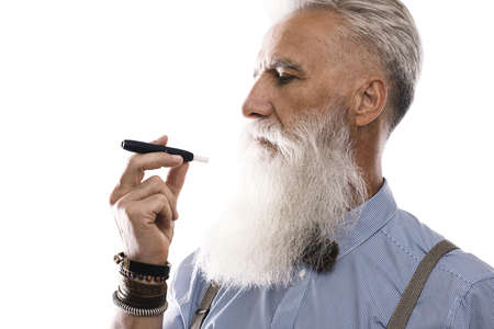 Portrait of senor man who is smoking electronic cigarette.