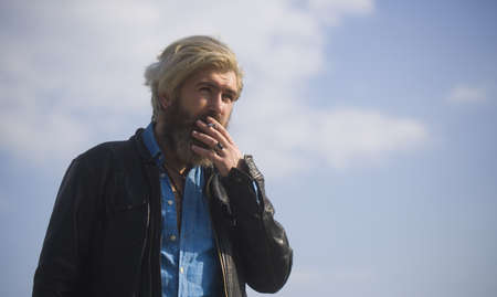 Man with beard smoking cigarette. Young bearded hipster in jacket at cloudy sky on natural background.