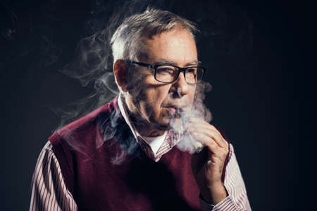 Portrait of serious senior man who is smoking cigar.