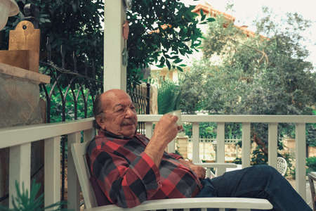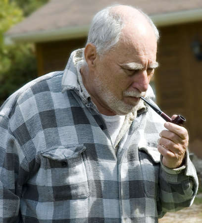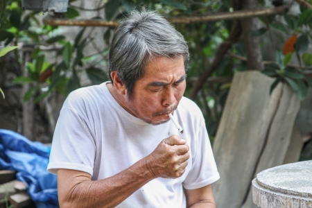 The old man lighting the cigarette at backyard