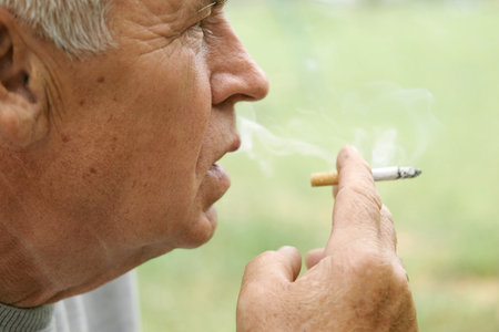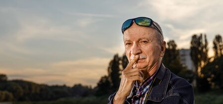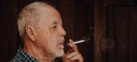 Senior man smoking cigarette outside, the cigarette addiction, unhealthy concept, bad habit