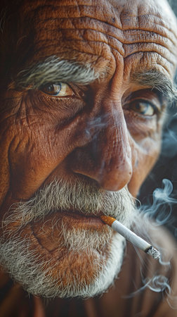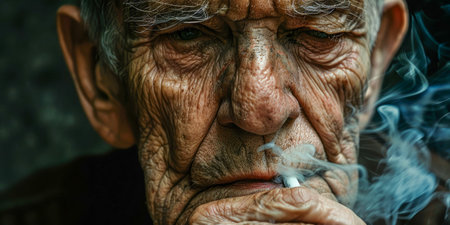 Closeup Artistic Photo of Aged Man With Grey Mustache Smoking, grain added