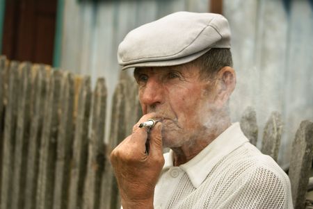 Portrain of old farmer smoking cigarette wiht blur background