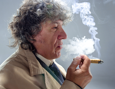 Close up portrait of brutal grey haired mature man looking away while smoking cigar