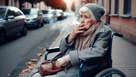 Asian senior woman holding a cigarette smoking,elderly smokers smoking in wheelchair,smoking is dangerous to health,causes various serious diseases,cancer,emphysema,addicted to cigarettes and difficult to quit