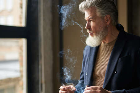 Stylish serious middle aged man with beard looking away while holding cigar and glass of whisky, standing in loft interior
