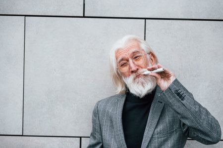 Senior businessman in formal clothes, with grey hair and beard is outdoors smokes electronic cigarette