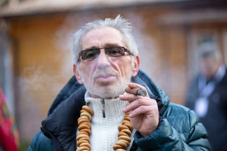 Belarus, the city of Gomel, March 09, 2019.Belarus, the city of Gomel, March 09, 2019.Maslenitsa.A man with a cigar at the festival Maslenitsa.
