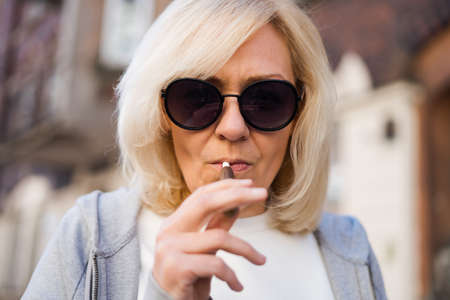 Middle aged blonde European woman smoking heated tabacco e-cigarette outdoors on the street. Alternative smoking way