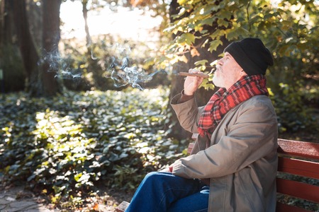Delighted relaxed man sitting on the bench while smoking a cigar