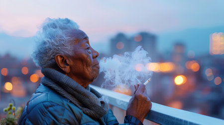 Sad and thoughtful elderly African American woman smoking cigarette on Cityscape Balcony at night with blurred city lights. Concept of loneliness, depression, stress, introspection, bad habits.