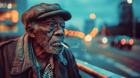 Sad and thoughtful elderly African American man smoking cigarette on urban street at night with blurred city lights in background. Concept of loneliness, depression, stress, introspection, bad habits.