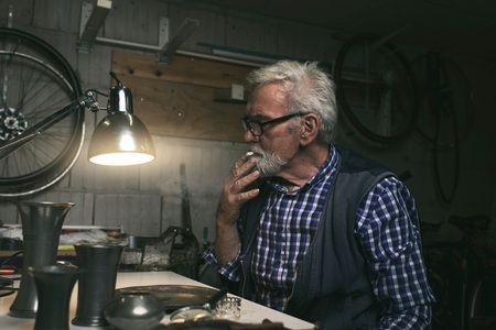 Smoking thoughtful man behind table with ancient tin vases and plate.