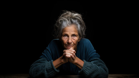 Portrait of senior woman sitting in front of a black background.