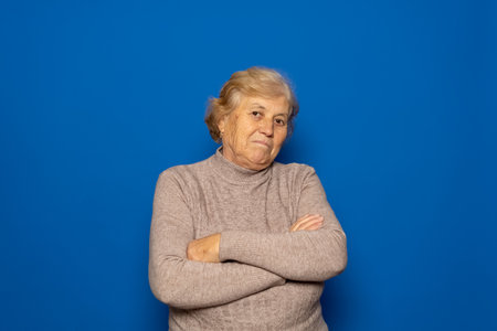 Profile of elderly wrinkled caucasian lady sadly gazing into infinity, medium close up studio shot with blue background. High quality photo