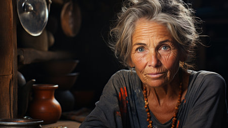 A senior woman from Russia gazes directly at viewer, highlighting her wise, expressive features. Soft lighting creates a warm atmosphere, emphasizing her character and life experience. Generative AI.