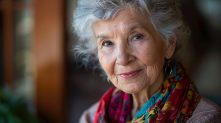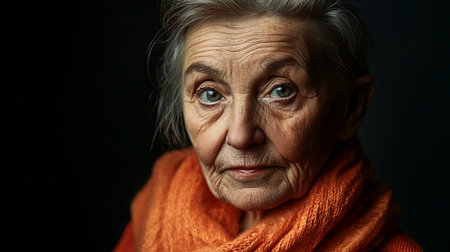 Senior woman with gray hair and deep-set eyes, adorned in an orange scarf, looks directly at the viewer, conveying a sense of wisdom and introspection, AI generated