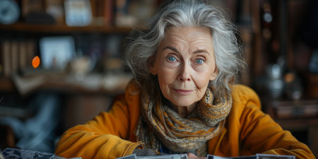 Elderly woman with a gray hair and kind expression sitting among old photographs in a cozy room.