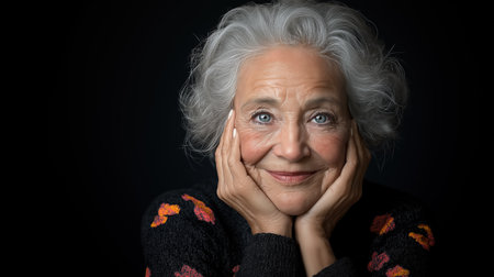 An elderly woman with beautiful silver hair smiles widely while resting her hands on her cheeks. Her warm expression radiates joy against a dark background, showcasing her wisdom and grace.