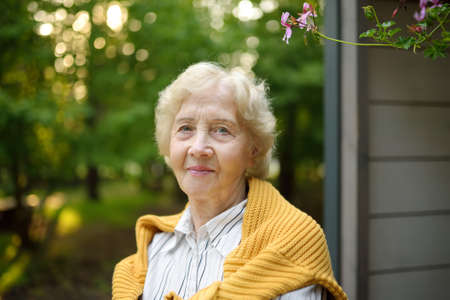 Portrait of beautiful senior woman with curly gray hair. Old woman near her home. Active longevity concepts.