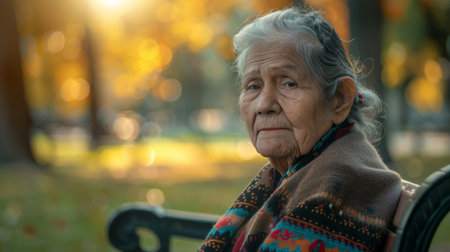 Portrait, elderly Mexican and woman sitting in park. Senior, female and mental health concept