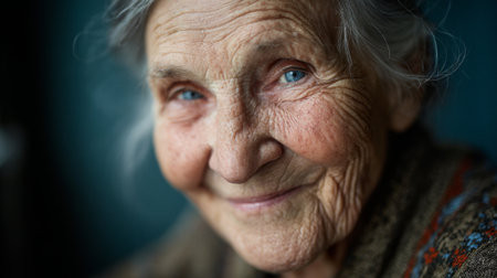This close-up portrait captures an elderly woman with blue eyes and a warm smile, showcasing her character and life experiences. The image radiates emotion and kindness.