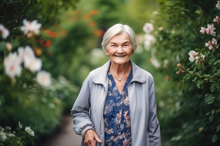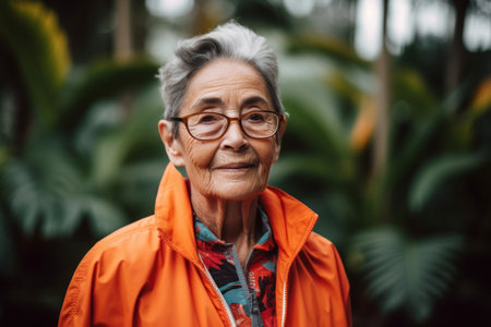 Portrait of a fashionable elderly lady with vibrant attire in a lush garden setting