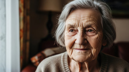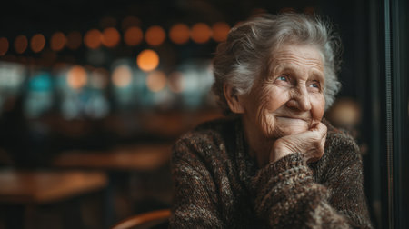 A warm portrait of an elderly woman with gray hair, lost in thought while looking out of a window. Her cozy sweater and soft lighting create a serene atmosphere, evoking nostalgia.