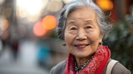 An elderly woman with gray hair smiles warmly while wearing a red scarf. The woman is standing in an urban environment with blurred lights in the background. The warm colors of the photo create a sense of joy and contentment.