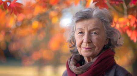 Elderly Caucasian woman enjoying autumn in a park, Concepts of aging gracefully, wellness, seasonal outdoor activities. Copy space.