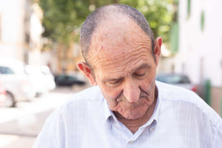 Portrait of upset grandfather, old retired man depressed, headache in elderly man