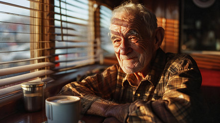 Cheerful man senior engaging in conversation at a coffee shop, exemplifying active elderly lifestyle. A.I.