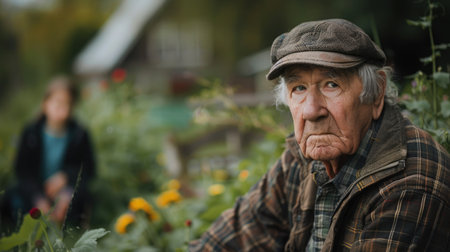 Elderly man sitting in a garden, looking lost and confused, with a family member watching over him, highlighting the importance of supervision.