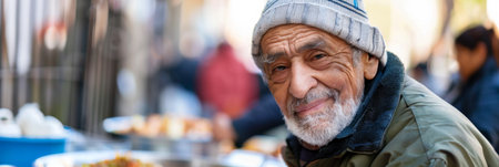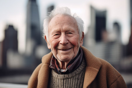 An old man wearing a gray cap and a coat warm smiles warmly while standing on a busy city street, showing the essence of urban life and seniority in a modern setting.