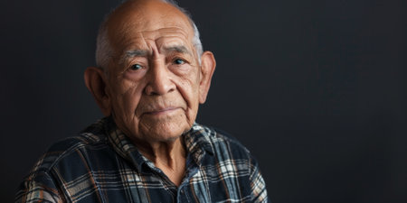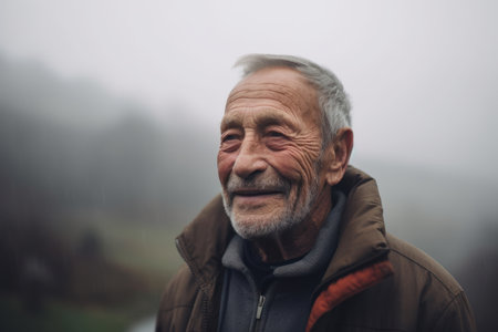 An elderly person their face etched with the lines of time smiles wistfully against a lonely abstract background