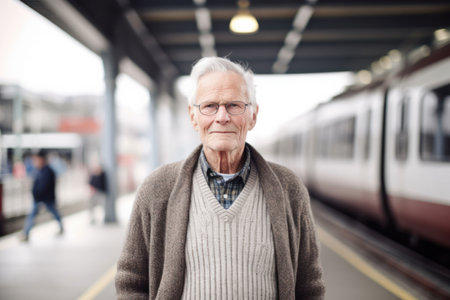 Portrait of an elderly man in a cap and glasses on the railway station.