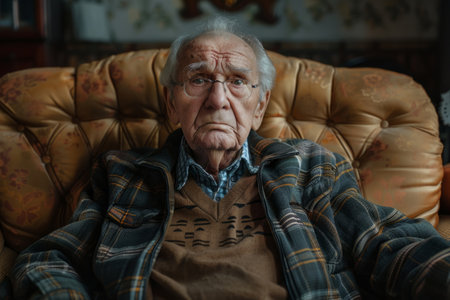 Senior man with gray beard and glasses, seated in a warm, inviting room surrounded by books, reflecting on life experiences in a peaceful atmosphere