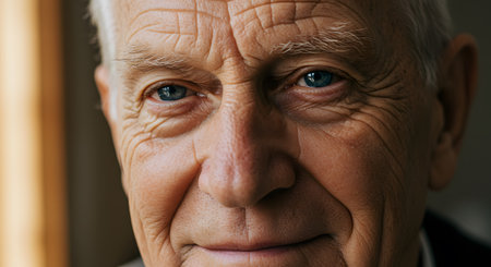 Close-up Portrait of an Elderly Man with Expressive Blue Eyes and Wrinkles