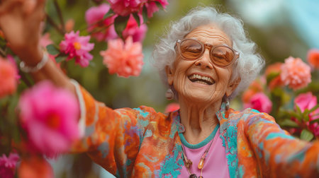 Elderly Woman with Sunglasses Enjoying Nature in Garden with Colorful Flowers.