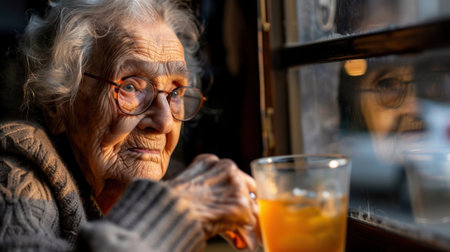 Elderly woman gazing thoughtfully out of window, holding glass of orange juice. warm light creates serene atmosphere, highlighting her wise expression and cozy interior