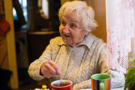 Elderly woman, drinking tea sitting at the table in the house. Grandmother.