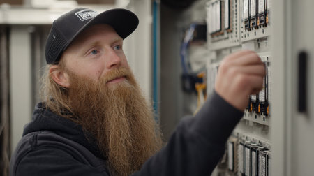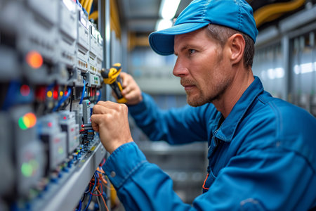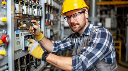Technician inspects and maintains an electrical panel in a workshop setting, ensuring equipment is functioning properly and efficiently during the daytime