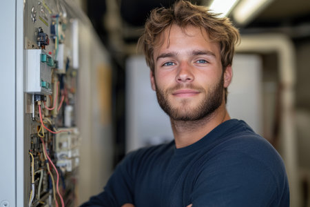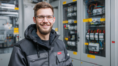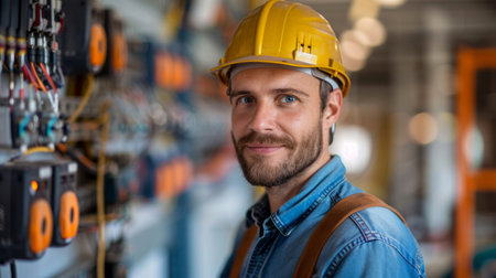 Portrait of a male electrician standing in front of electrical panel