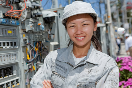 Female technician is smiling confidently in an industrial setting, surrounded by electrical equipment and vibrant flowers, showing casing expertise and pride.