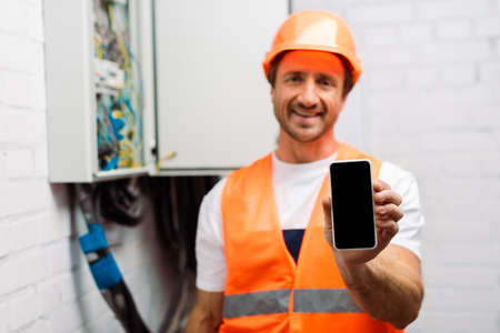 Selective focus of smiling electrician holding smartphone with blank screen near electrical distribution box