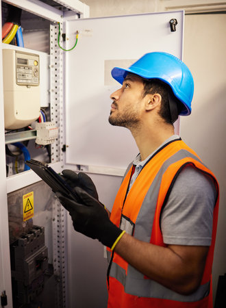 Tablet, electricity and man with control box for repair, maintenance and inspection for power. Engineering, electrician and male worker on digital tech online for service, construction and labor