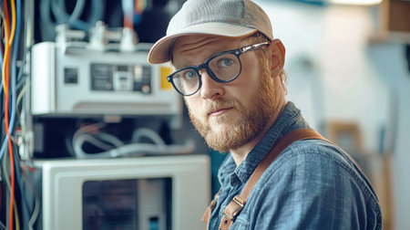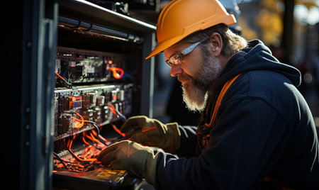 Portrait of electrician working on electrical panel in a server room, Commercial electrician working on a fuse box, AI Generated