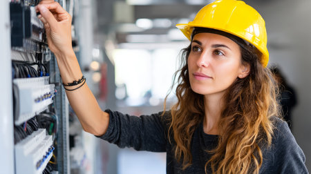 A young woman in a hard hat and gloves focuses intently on wiring an electrical control panel. The image showcases her dedication and skill in the engineering field.